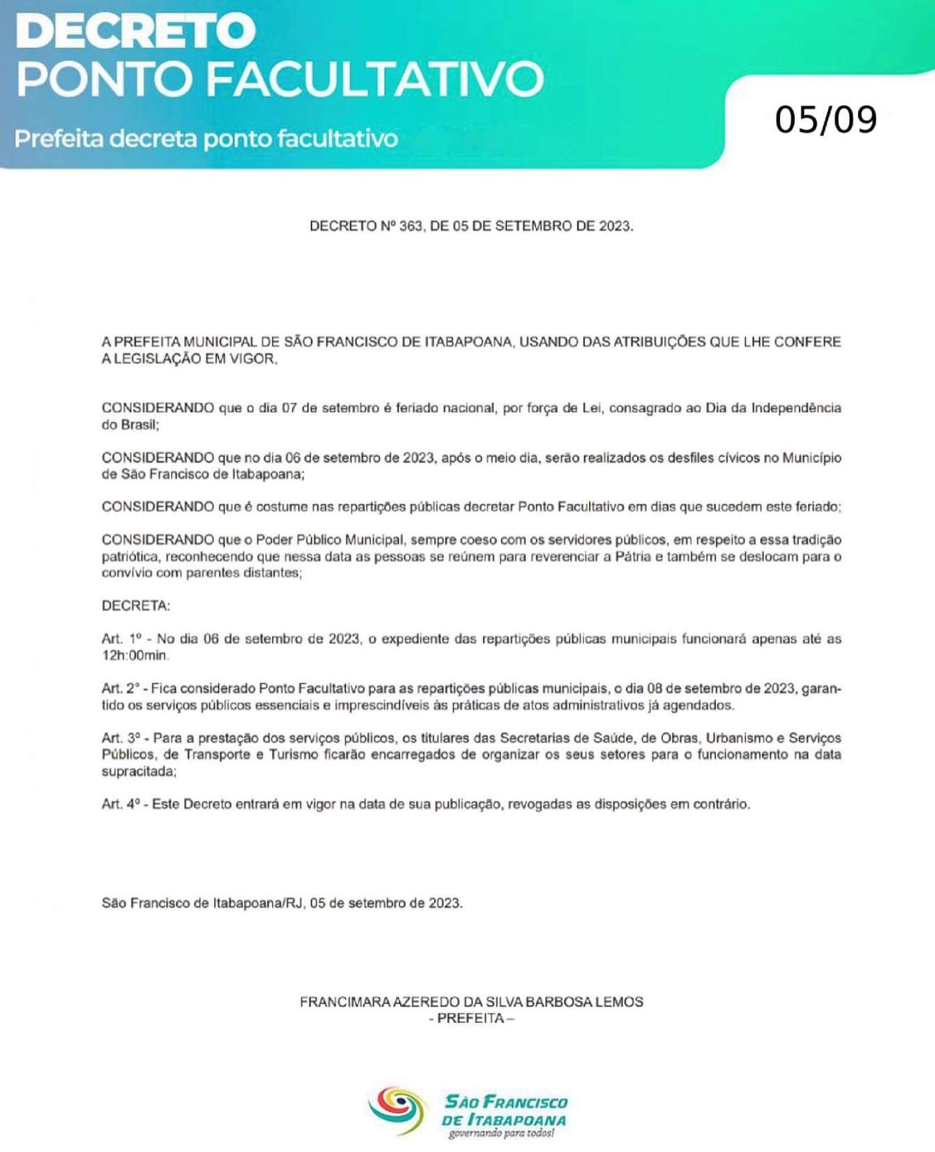 Devido às comemorações do feriado nacional da Independência do Brasil, a Prefeitura de São Francisco de Itabapoana (SFI) decretou ponto facultativo nas repartições públicas municipais a partir do meio-dia desta quarta-feira (6) e na sexta-feira (8). A medida foi publicada do Diário Oficial desta terça-feira (5).