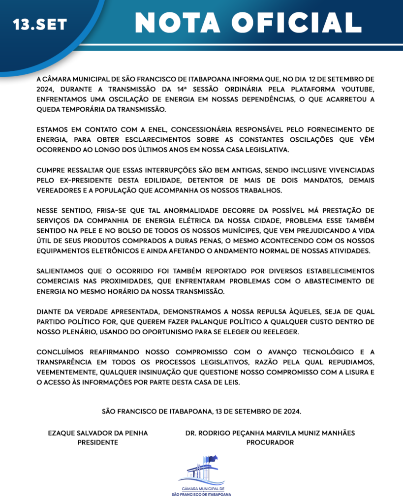 A Câmara Municipal de São Francisco de Itabapoana informa que, no dia 12 de setembro de 2024, durante a transmissão da 14ª Sessão Ordinária pela plataforma YouTube, enfrentamos uma oscilação de energia em nossas dependências, o que acarretou a queda temporária da transmissão.